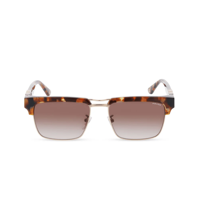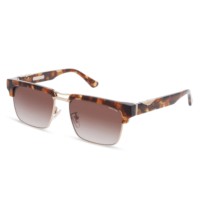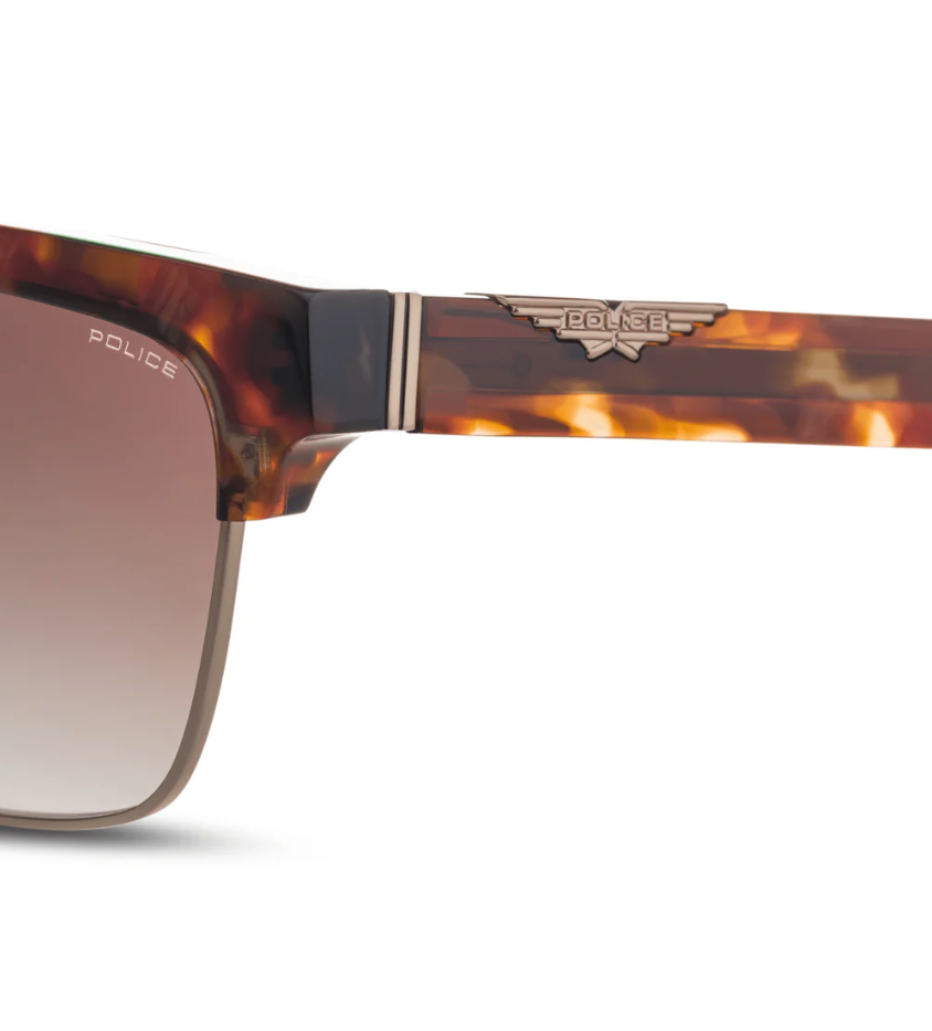 Origins 62 sunglasses are made of acetate combined with metal, giving them a vintage '90s look. They are rich in details, with a double bridge and a metal Police logo on the outside of the temples. Available in various color combinations to suit every style, from vintage options like speckled Havana to more classic colors like black with gold details.
